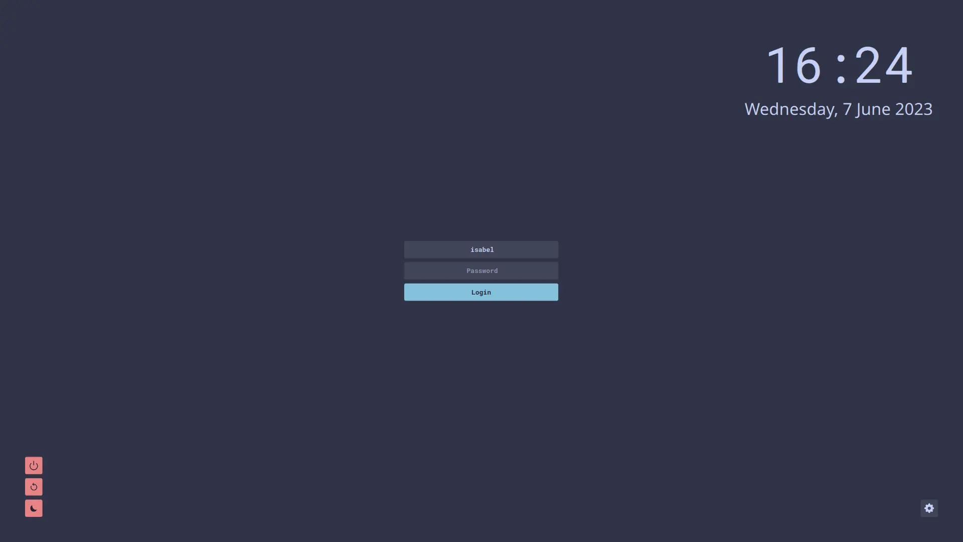 Font: The chosen fontFontSize: The text sizeClockEnabled: Whether the clock is on or off, this should be set to eithertrueorfalseCustomBackground: When this istrueit will read fromBackgroundto render the custom background image, this should be set to eithertrueorfalseBackground: This is the location of the background image, it is recomended to use the providedbackgrounds/directory to store the imagesLoginBackground: This is a extra background around the login panel, this should be set to eithertrueorfalseUserIcon: When this is set totruethe user icon will be displayed, this should be set to eithertrueorfalse