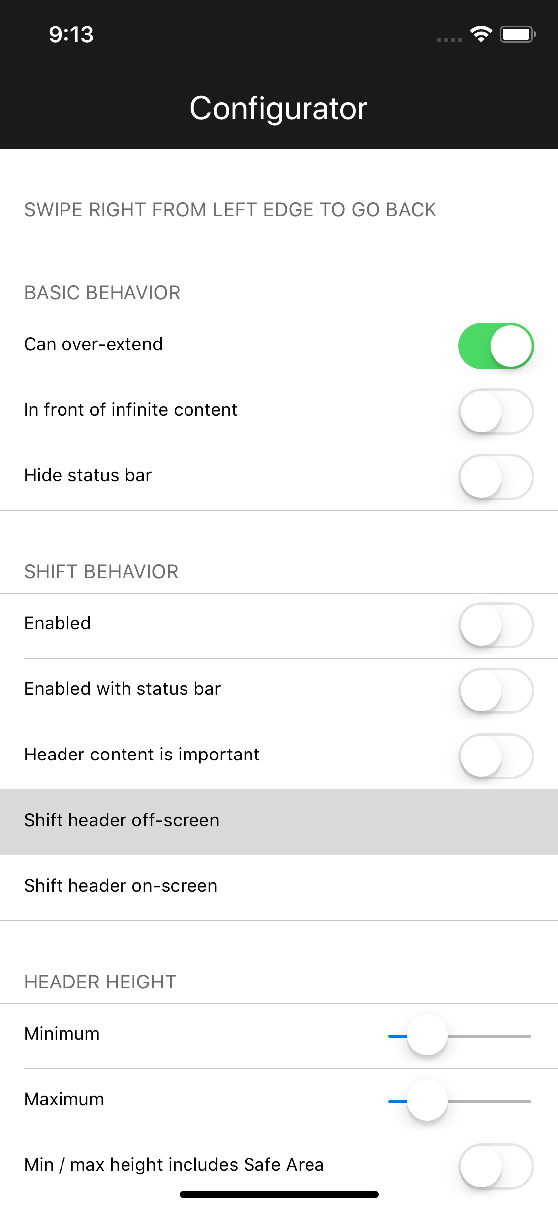 This new shift behavior mode enables the flexible header to mimic the behavior of UINavigationController's setNavigationBarHidden:. When the shift behavior is set to this new value, the flexible header can be hidden or shown using the shiftHeaderOnScreenAnimated: and shiftHeaderOffScreenAnimated: APIs, but user interactions will not affect the header's visibility.